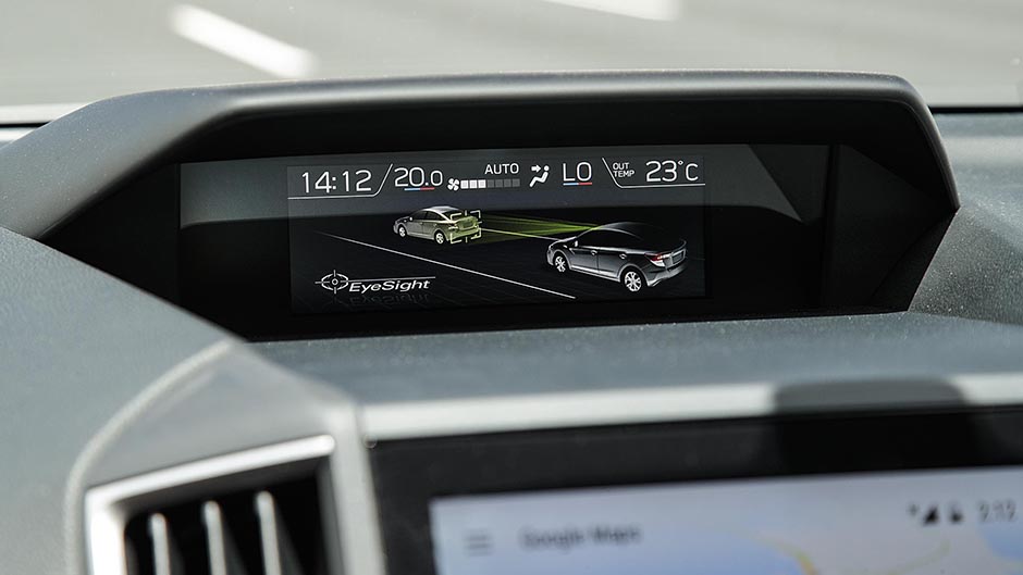 Its EyeSight active safety system uses a CMOS camera for better operation and the pre-collision braking function now works up to 50km/h. It also takes care of obstacle detection, the active cruise and lane departure, amongst other things. The system works well, with few false alerts regarding imminent collisions, even if the lane departure is a bit hyperactive. You can always turn it off.