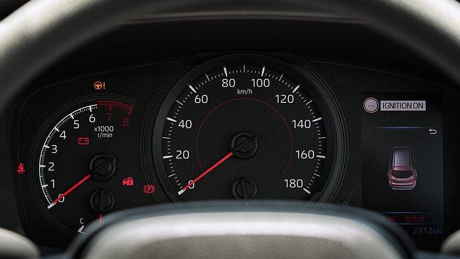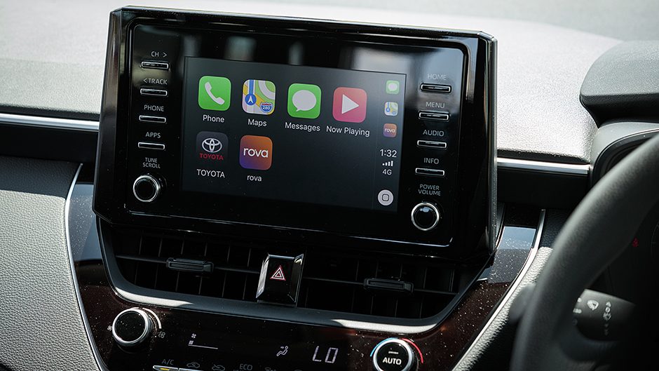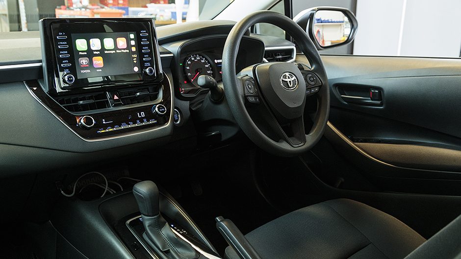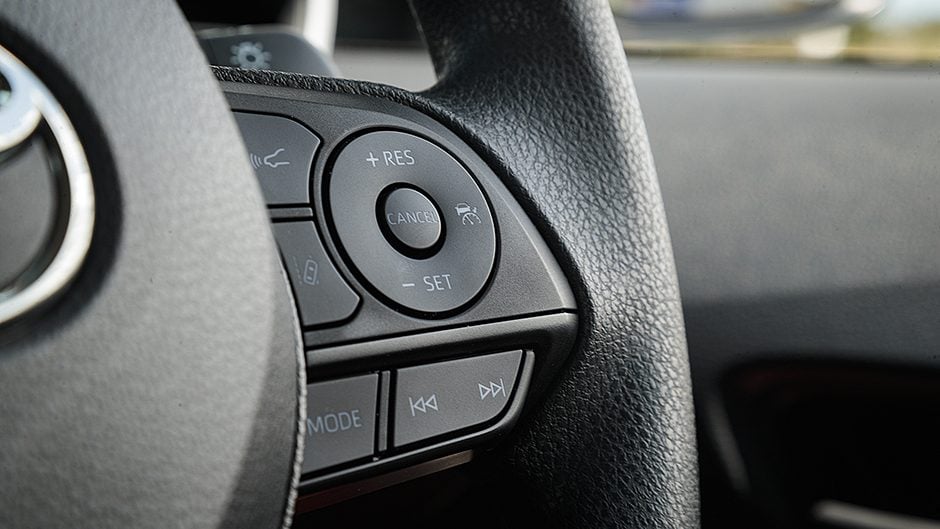 There’s no charge pad but it has two USB charge ports, a smart key and a reversing camera. And while you grip a urethane steering wheel, the spokes house the controls for Toyota’s Safety Sense package, giving it a better fit-out than some entry-level BMW and Mercedes-Benz models. AEB is present, complete with pedestrian and cyclist detection, as well as active cruise control, although this isn’t the all-speed version, inoperative below 30km/h in traffic.