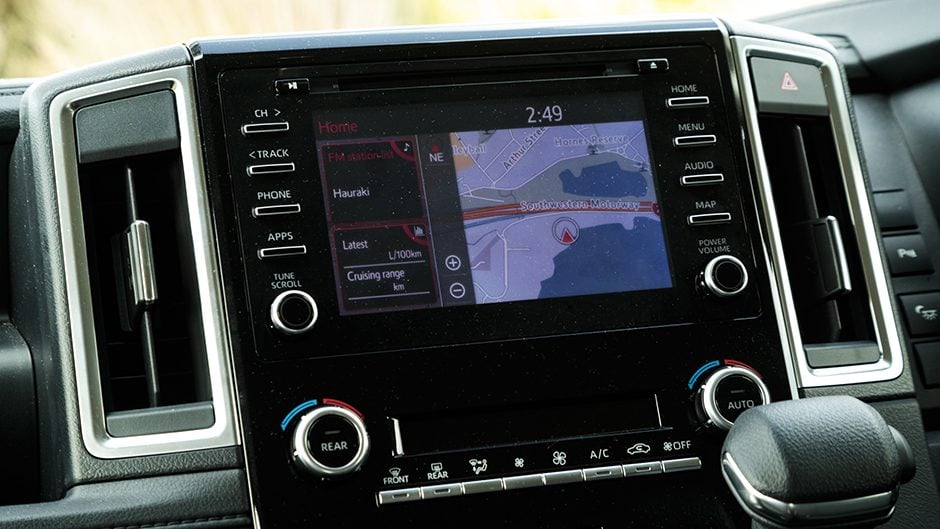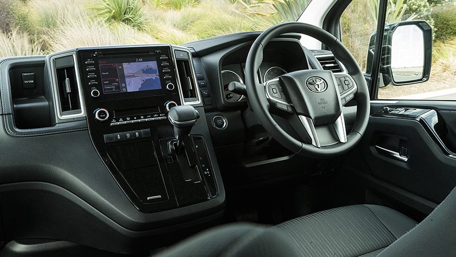The cabin has been treated to some piano black on the dash, a few soft touch surfaces and the high grade ventilation controls and infotainment system disguise its Hiace origins well. Its leather-clad steering wheel homes the buttons for the safety systems, the Granvia coming with all of Toyota’s crash-mitigating tech, helping it achieve a five-star ANCAP rating. Nine airbags including front and rear curtain shield airbags also contribute. Other items include front and rear climate air controls, a smart key, rear ambient lighting and six USB charging ports.