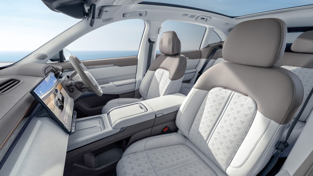 Step inside and it feels more like a luxury SUV than its price-range brethren. Even the entry-spec version gets soft-touch trim, a broad centre console and a clean dash layout. The main screen is a 16-inch Mini-LED unit running Qualcomm’s Snapdragon 8295 chip — quick, sharp, and packed with features. There’s a crazy 36.2-inch augmented reality head-up display, Taycan-style digital dials and actual buttons on the steering wheel instead of haptic pads.
