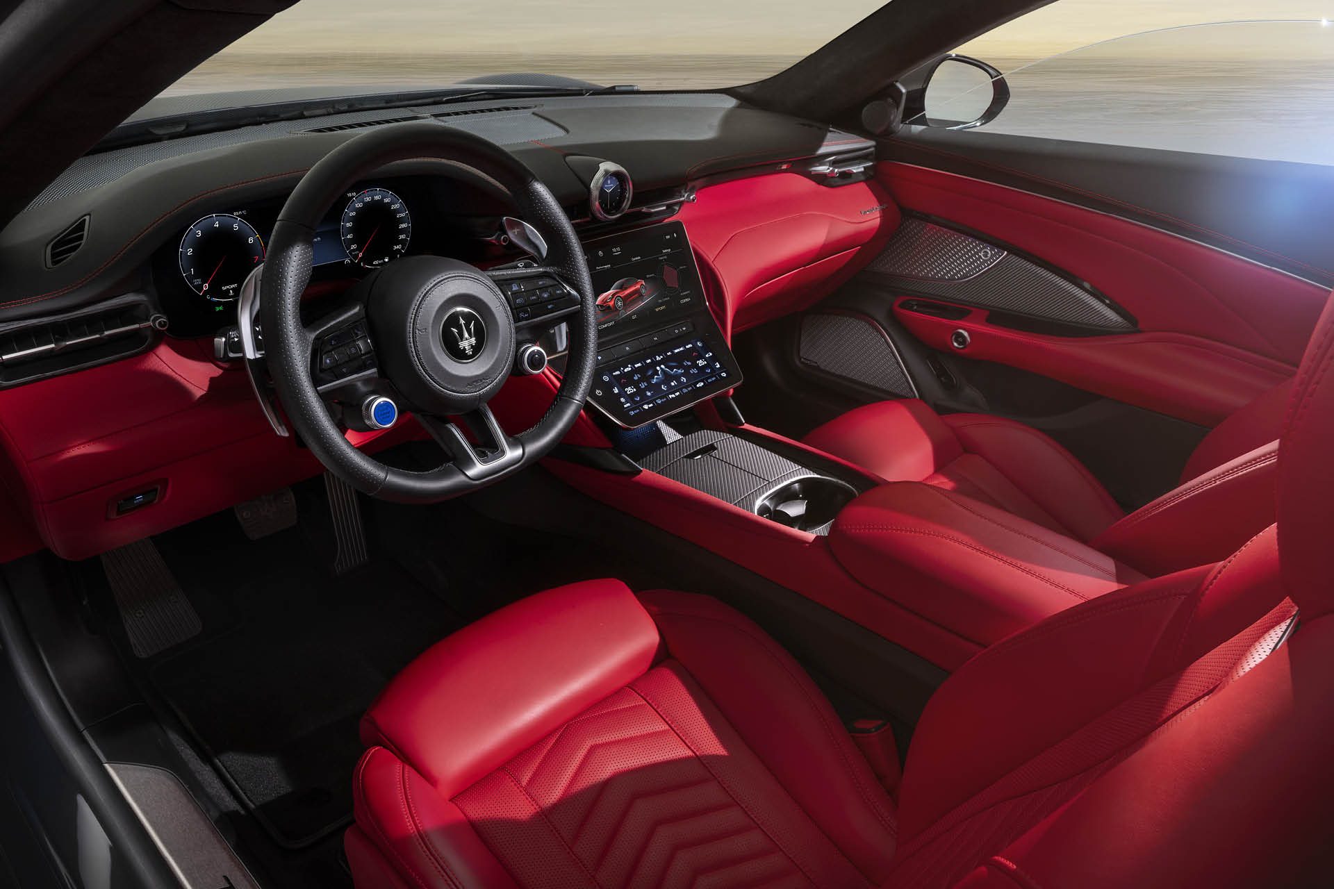 Both feature Maserati’s 3.0-litre twin-turbocharged V6 ‘Nettuno’ engine, with the Modena making 365kW, good for an acceleration from 0 to 100km/h in 3.9 seconds. As for the top-of-the-range petrol model, the Trofeo pumps out 410kW, bringing its sprint time down to 3.5 seconds.