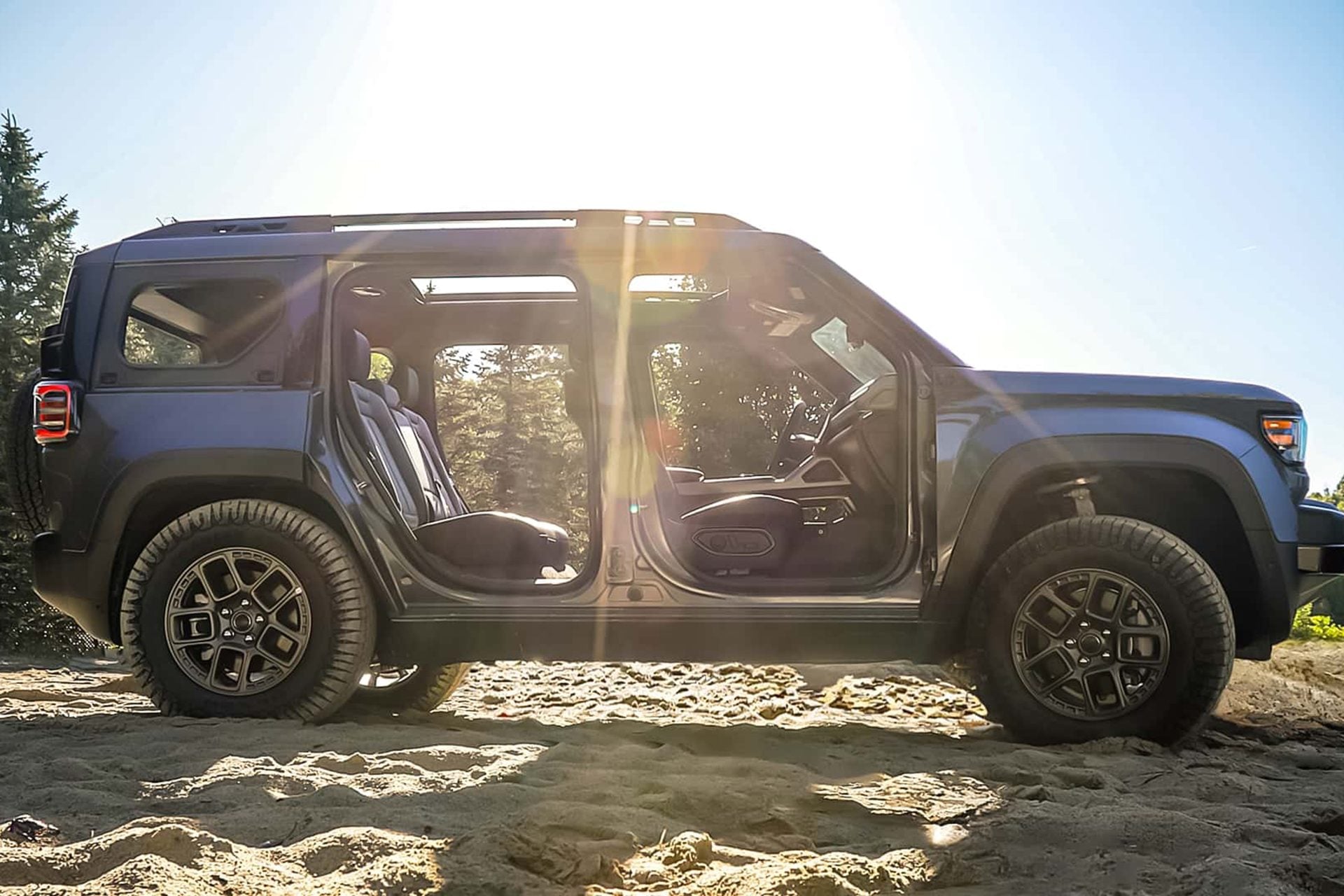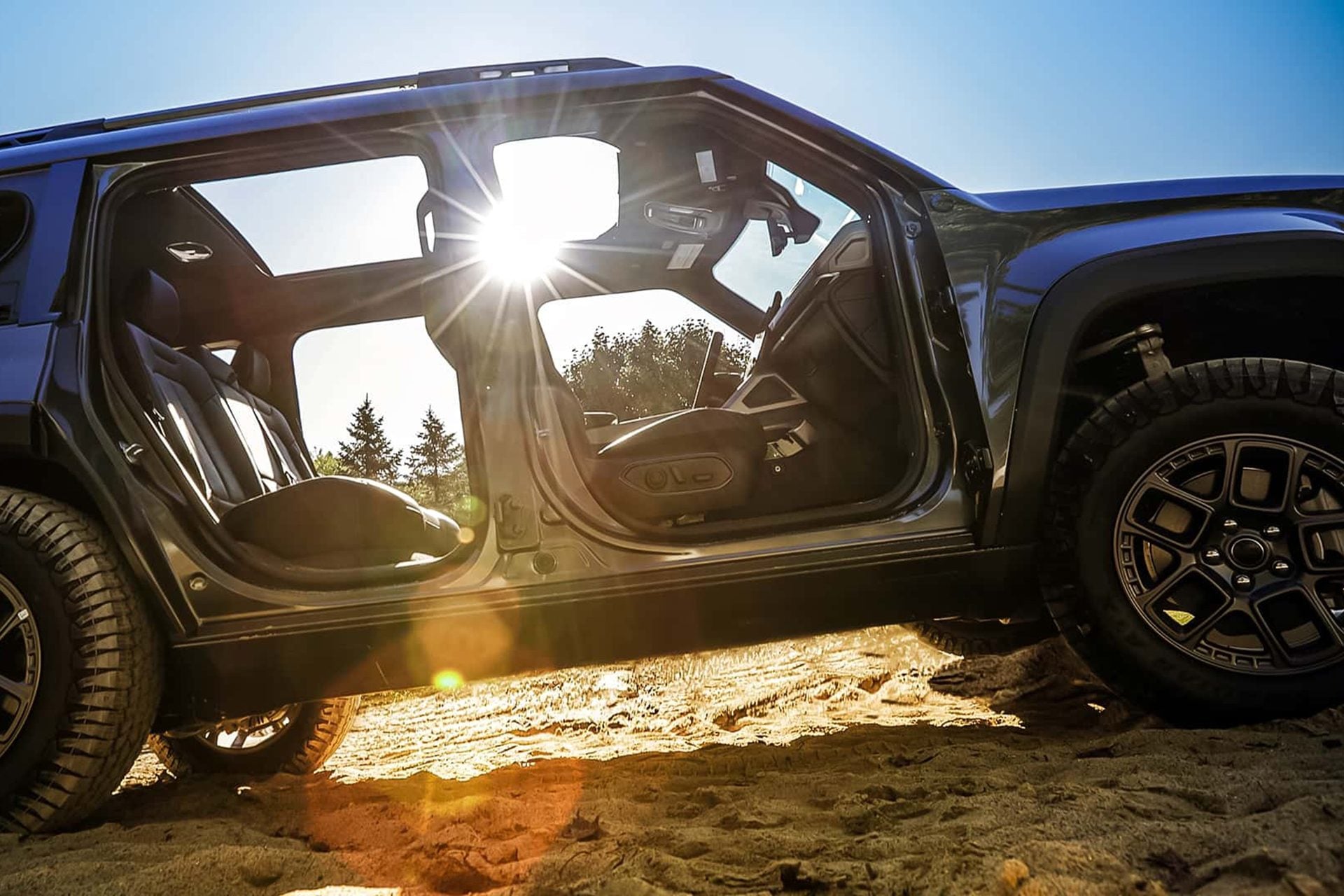 Doors and the rear window can be removed without tools, a feature Jeep is keen to emphasise as it positions the Recon as the “electric adventure alternative” to the Wrangler.