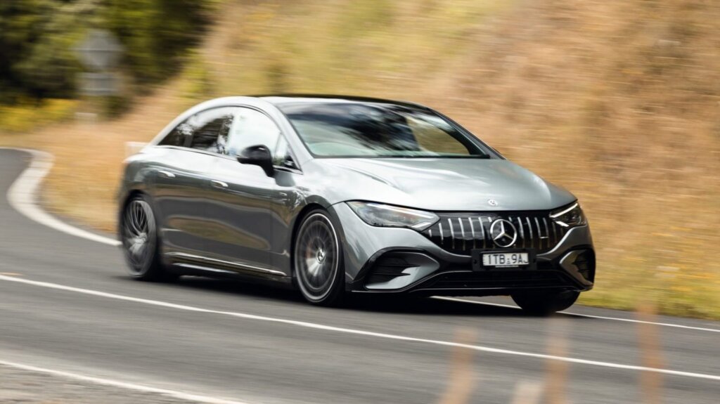 We also got a crack in a trio of EVs. It was fun to revisit the EQA, Mercedes’ smallest and best selling EV. With 140kW and 385Nm this is no slouch on track. It’s dead quiet on the go, and throughout the afternoon had only used 30 per cent of its range despite being pushed hard by all and sundry. That was followed by a quick spin in the EQE 53 4matic, the initial wham-bam lap with a Mercedes driving instructor at the helm. He stopped it up for a race start after exiting pit lane which smacked my head back into the goosedown headrest. Ha ha. Crikey it jets off the mark, like the similar EQS 55 but then with almost 1000Nm available from standstill and 460kW on hand that’s no great surprise. And with weight nice and low and being well balanced end to end it can corner like a champ as well.