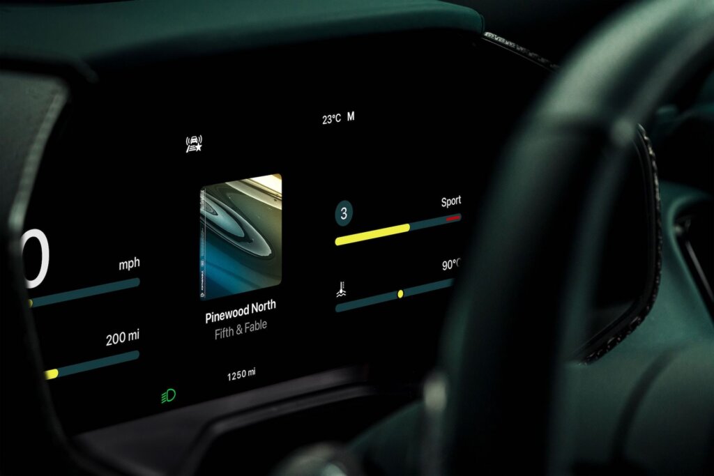 One of the headline features is CarPlay Ultra’s ability to take over the instrument cluster. Apple provides manufacturers with a design toolkit, which each car brand can customise to suit their models. Aston Martin has developed multiple cluster layouts, from classic twin roundels in racing green to a full-screen navigation view with minimal driver distraction. Swiping left or right on the steering wheel’s thumb pad allows drivers to switch between these options, while up and down gestures change the data displayed in the centre such as tyre pressures, trip info, or media.