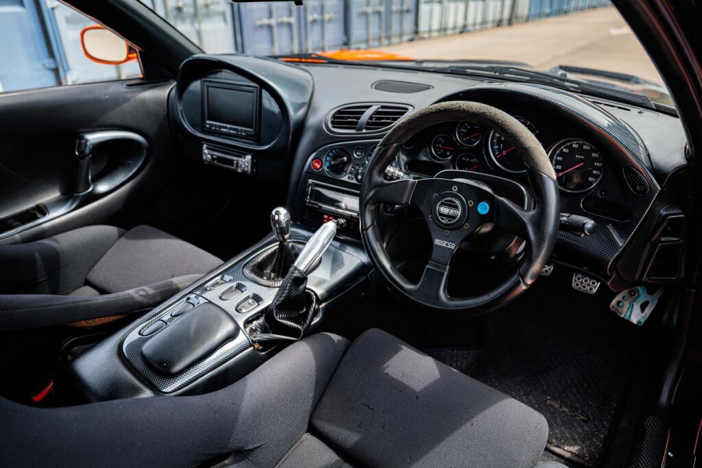The car was overhauled during the fitment of the kit in the early 2000s gaining a new clutch, brakes, coil-over suspension and Blitz Nur-Spec exhaust system. The RX-7’s twin-rotor turbocharged engine was rebuilt to stock specs.