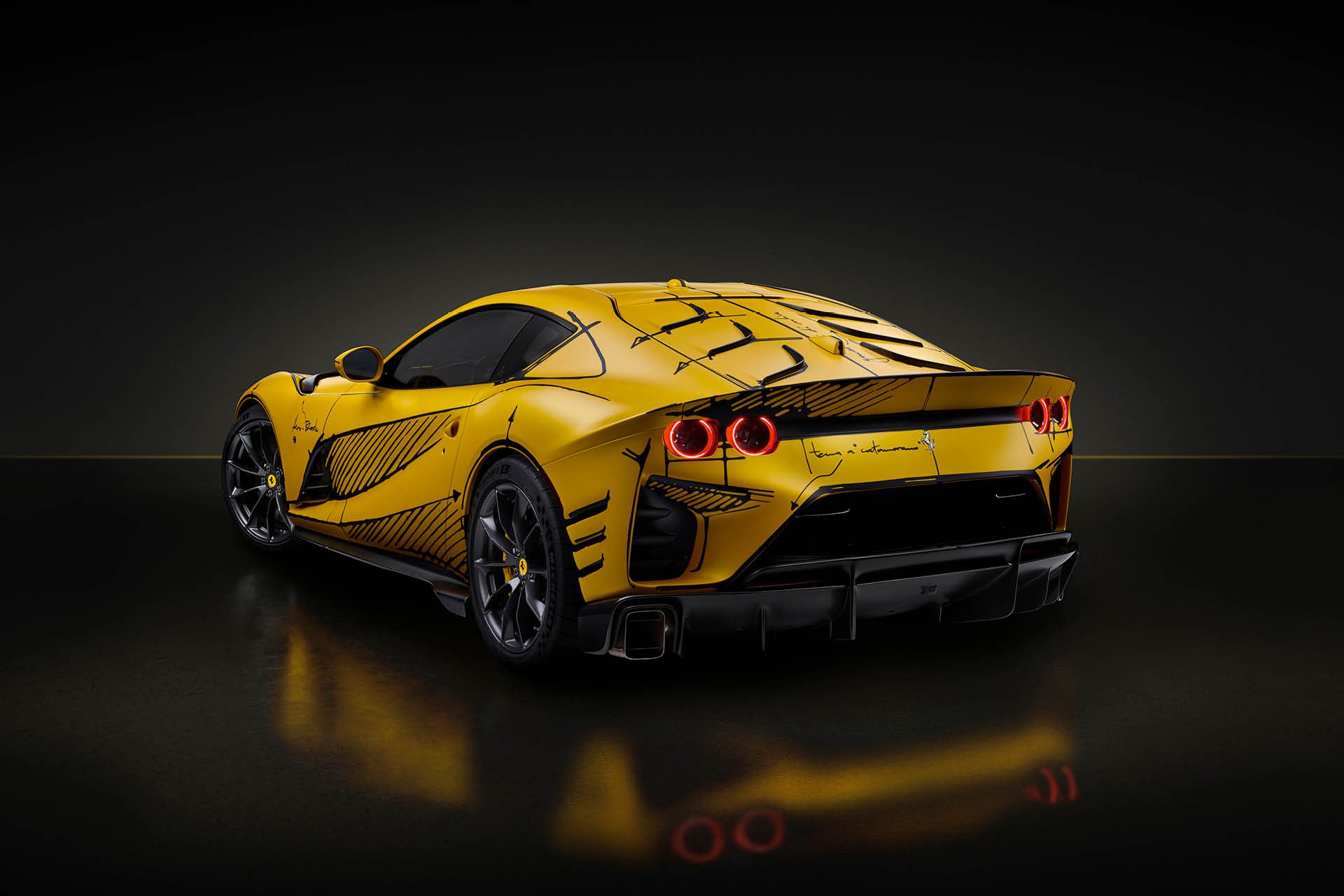 The supercar’s unique livery is made up of matte black pen strokes that clad its Giallo Tristrato-coloured body, a nod to the way Ferrari designers transfer their initial styling ideas to one another on “iconic” yellow cards.