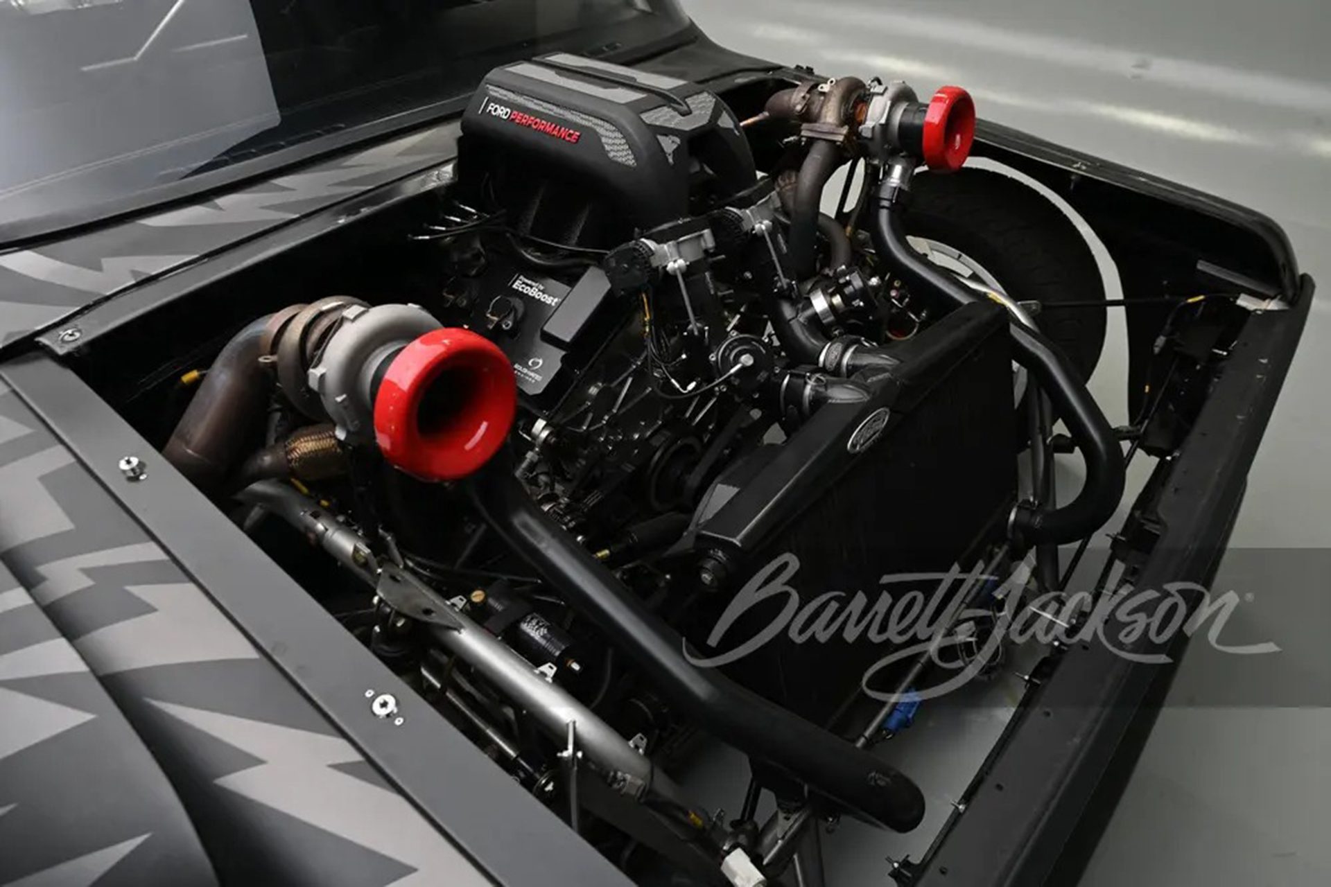 Its bold aesthetic includes hand-crafted aluminium body panels that replicate the classic 1977 F-150 silhouette. It is complemented by a low, wide stance, and flared fenders with the turbochargers prominently displayed through the hood.
