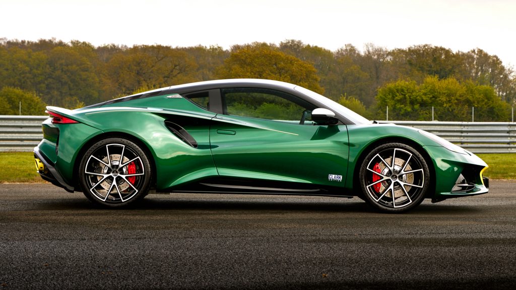 The body of the exclusive Emira features Clark Racing Green paint with a contrasting black roof and silver mirrors. There’s also a yellow racing stripe flared around the front end. This takes after Clark’s 1965 Indianapolis 500-winning Lotus Type 38. A machined aluminium fuel filler cap with a blue anodised centre, and yellow exhaust pipes further enhance the special look.Â