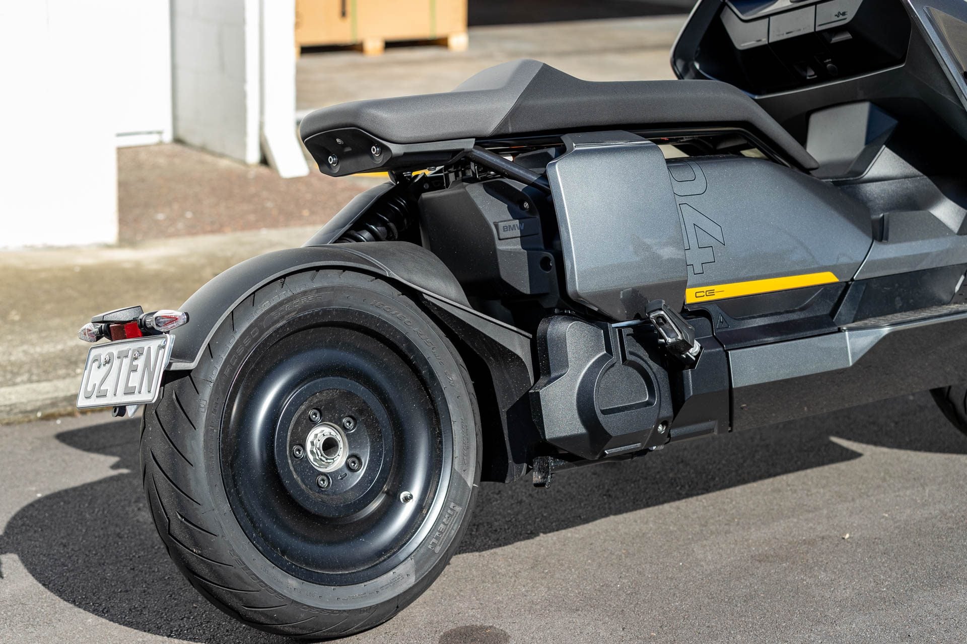 The battery pack that uses iX cell technology is carried low and is air cooled. The bike itself weighs around 220kg but with the weight low it feels like a regular maxiscooter to ride, only there’s no exhaust, no emissions. And there’s a side-opening storage compartment for a helmet or quick shop up at the grocery store. It’s also accessible without the rider dismounting.