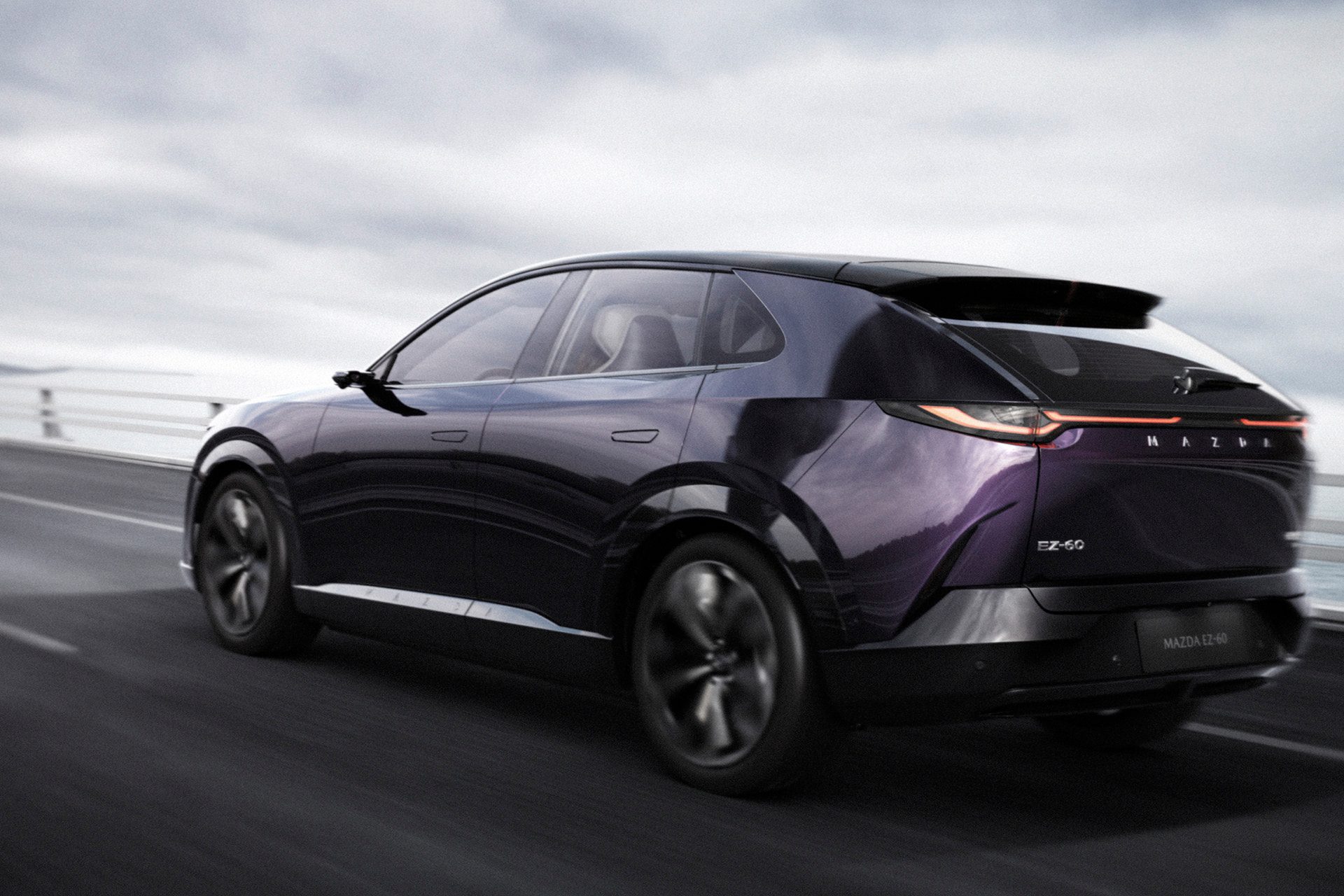 The EZ-60 is a Mazda-Changan joint venture project, like the 6e. The look is aggressive, low and wide, with large wheels and a small glasshouse. Its Mazda-typical grille features a 3D lighting surround. The grille has a small vent that funnels air into a wing in the bonnet, aiding aero.