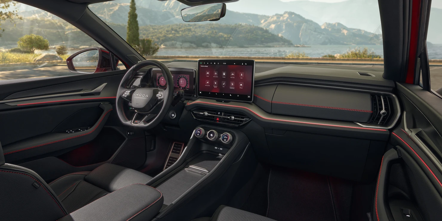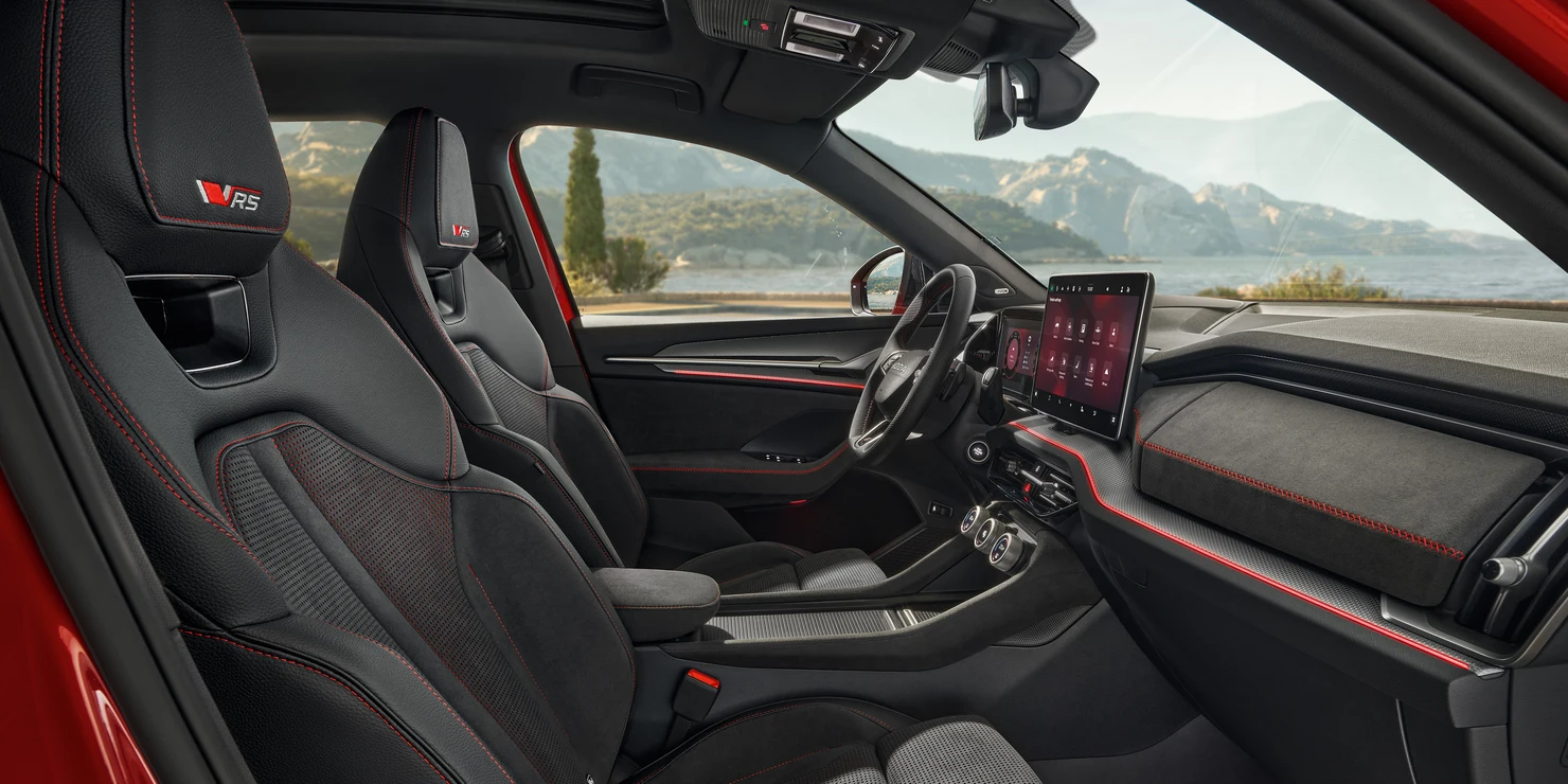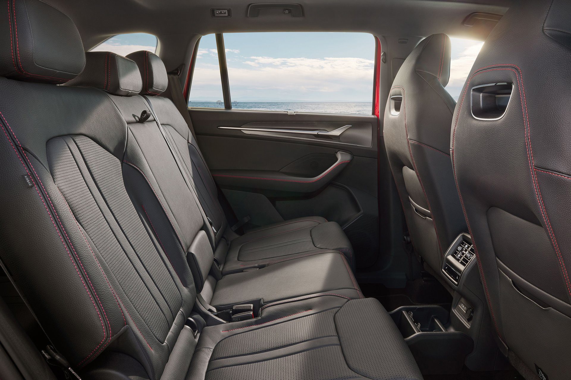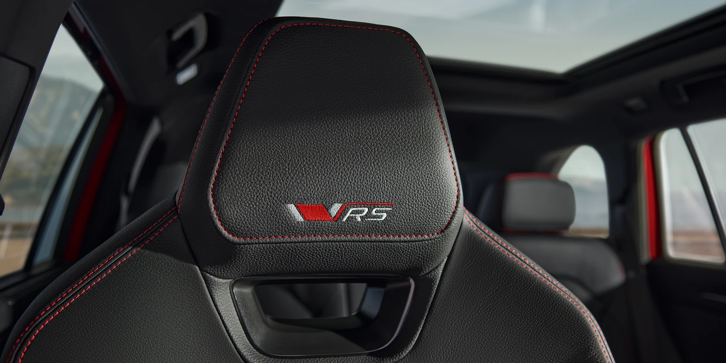 The RS Suite Design features sports seats with integrated headrests and black perforated leather/artificial leather with red contrast stitching. Kodiaq RS comes with a three-spoke multifunction sports steering wheel finished in red stitching and an RS badge. Laminated glass offers better sound insulation.Â