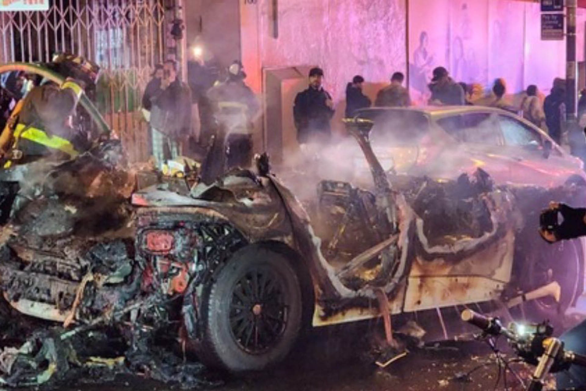 The side windows were subsequently smashed and another member of the group set the car alight with a firework, to which it quickly became fully engulfed in flames.