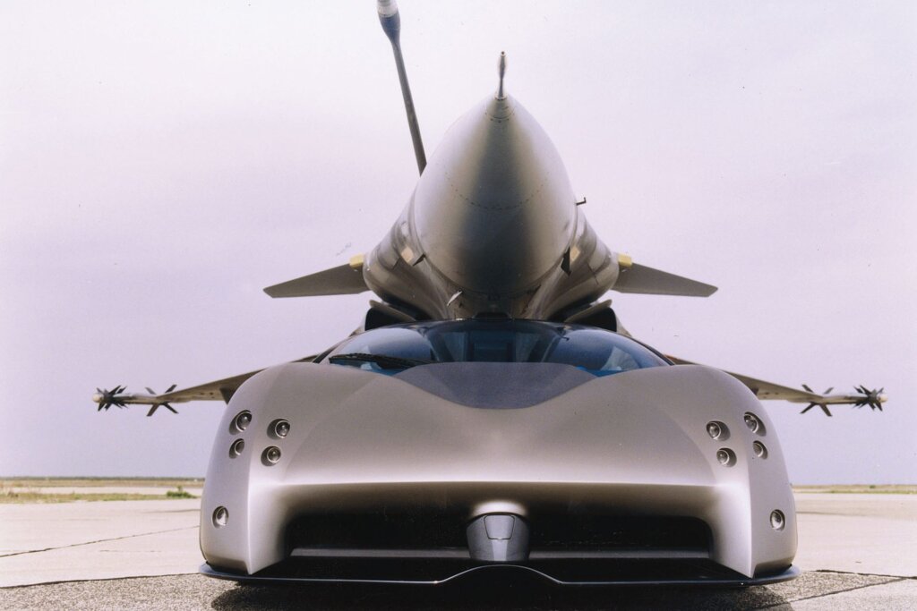 Inspired by the Dassault Rafale fighter jet, the Pregunta featured carbon-fibre bodywork, vast air intakes, scissor doors with canopy-style glass, and the same Matte Grey paint as the jet that inspired it. Inside, it carried through the aviation theme with Azure Blue Alcantara-trimmed bucket seats, fibre-optic lighting, rear-view cameras, and a Formula One-derived digital instrument cluster.