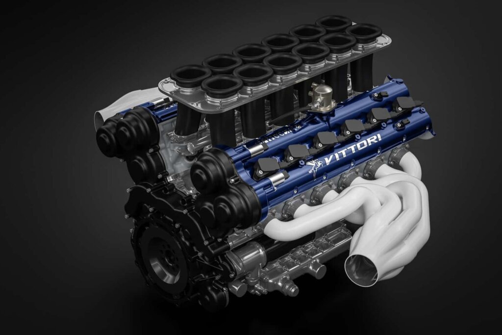 Power comes from a 6.8-litre hybrid V12, developed with engineering firm Italtecnica, paired with an electric motor on the front axle for a combined 1100hp. Vittori claims a 0–100km/h time of 2.5 seconds.