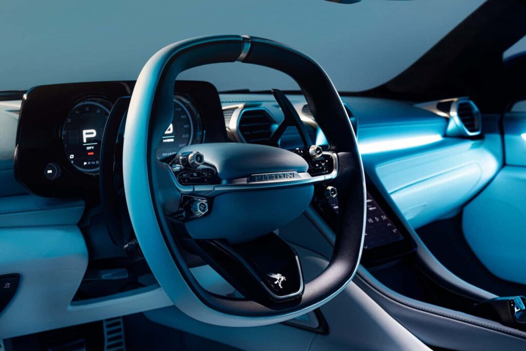 Designed in collaboration with Pininfarina, the Turbio’s styling fuses classic Italian drama with modern aerodynamics. Its sharp front end features a hexagonal grille flanked by slim headlights, while the sculpted rear showcases quad exhausts, a massive diffuser, and bronze highlights set against deep blue paintwork. The cabin takes inspiration from McLaren, with a vertically oriented touchscreen, minimalist layout, and digital instrument cluster.