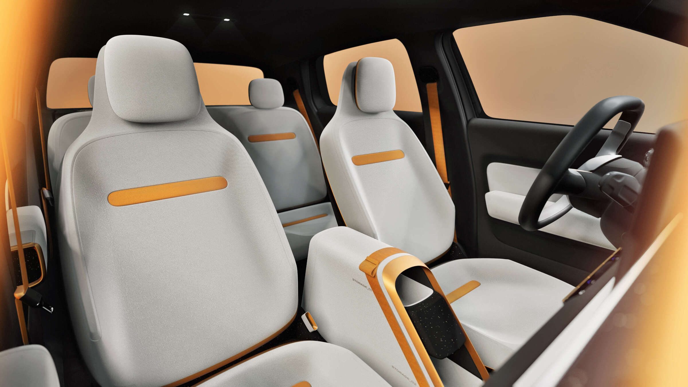 The concept’s cabin is simple, featuring interesting use of materials to retain interest. A small driver’s display and two outer air vents mimic the headlight shape, while a touchscreen sits above physical controls for ventilation, volume and heated seats.