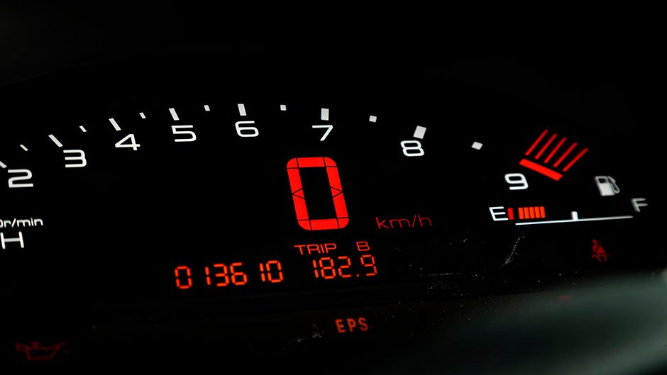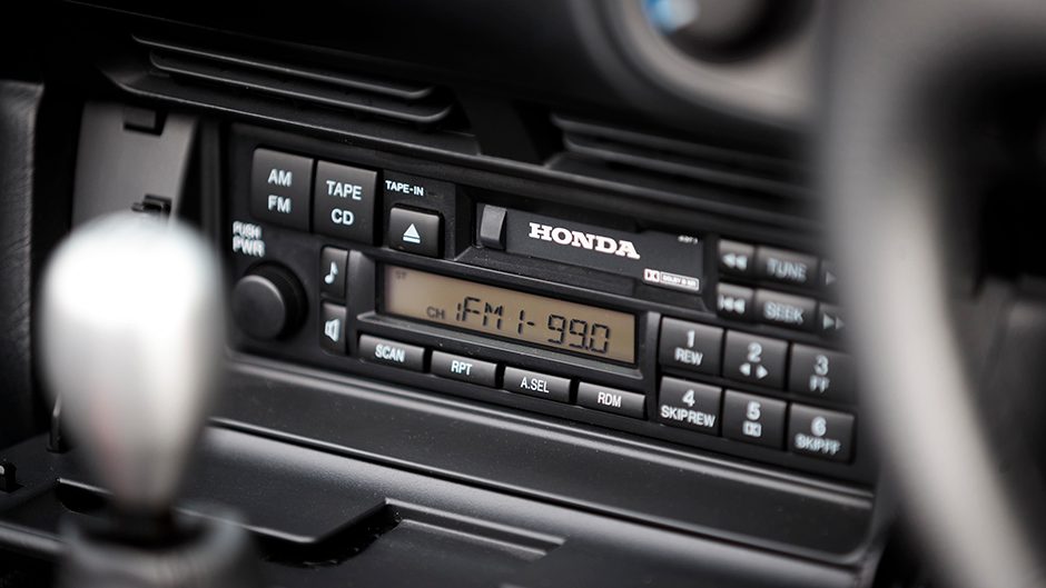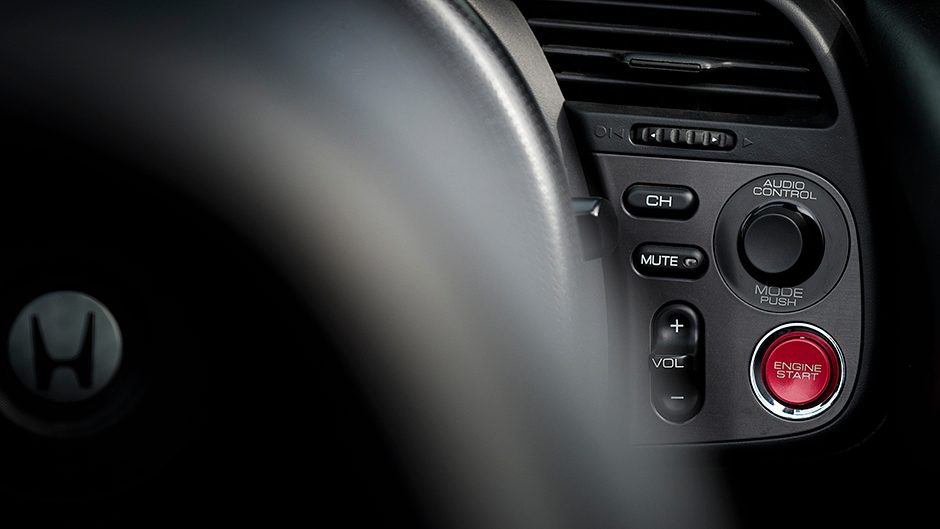 The start-up procedure requires the key and a prod of the big red button before the engine thrums into life. It’s a Honda so there are no aural theatrics here, just a light show from the instruments. This S2000 has done just 13,500km, and as I let the engine warm, I try to figure out the interior. Not that there’s much to it; it’s as minimalistic as the exterior. The controls are tactile and snappy, the original stereo hidden behind a push-to-release door, showing off its cassette receiver proudly. No Bluetooth here, kids. Behind the wheel is that awesome retro-futuristic dash, with a curved bar showing revs and a digital speedo readout beneath.