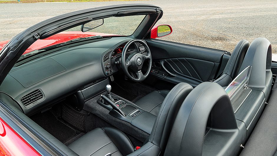 Slipping into the S2000 is not unlike getting into an MX-5, but with better, form-hugging seats. For what it’s worth, I’m about 183cm, and fit comfortably even if the steering wheel offers no adjustment whatsoever. The driver’s position is very much Mission Control; you have access to everything from air-con to audio. In fact, the passenger doesn’t even have a glove box to rummage around in.