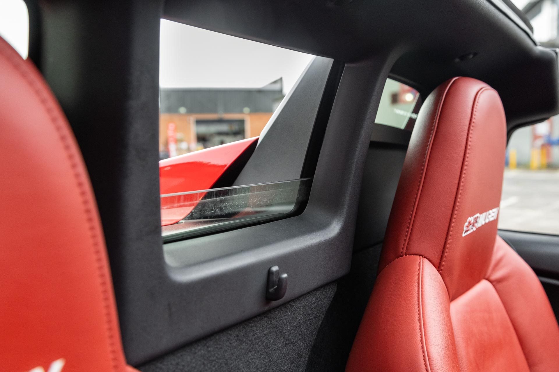 Inside there are the red leather seats and a leather bound steering with a mark at the 12 o’clock.