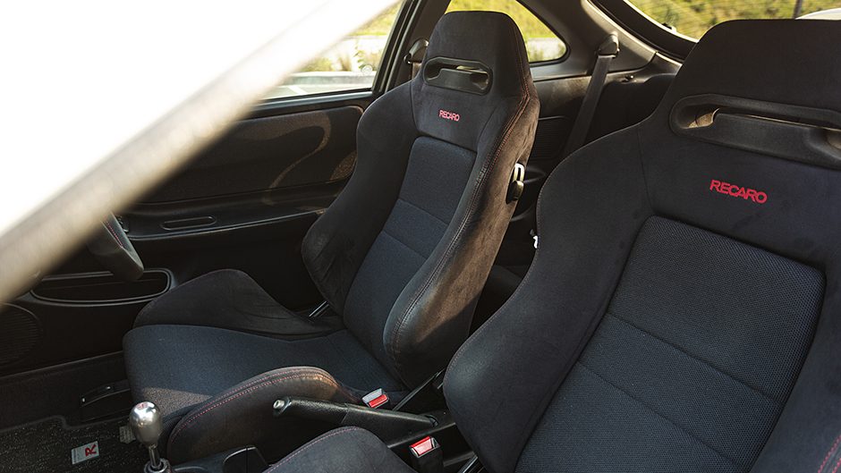 The Integra Type R tipped the scales at 1080kg, although later iterations with ABS and airbags were heavier. Chassis reinforcements, such as extra spot welds and thicker steel around critical areas stiffened things up while lower, firmer suspension and beefier antiroll bars honed the handling. Externally, the facelifted styling featured a subtle front splitter and mandatory-for-the-90s high rear wing, while inside a pair of Recaro SR3 seats in red or black Alcantara, a matching rear seat and Momo steering wheel set the R apart.