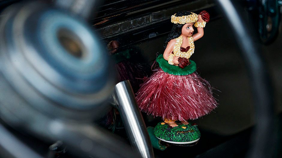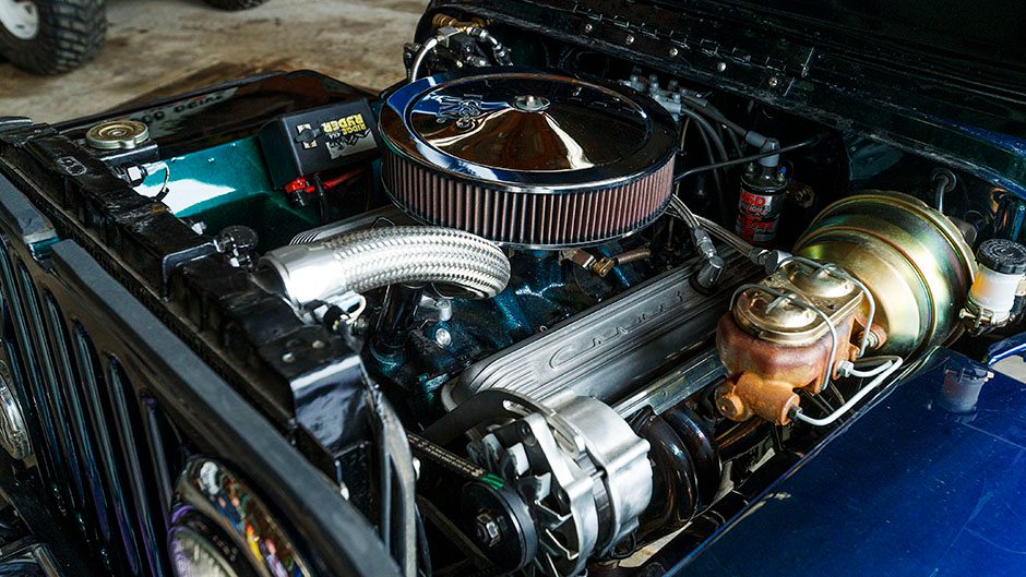 Williams’ passion is something shared by his partner Michelle who has her own Jeep, a fully restored 1952 CJ3, in the shed, albeit in the corner… Williams admits he was taking Michelle around the car shows and slowly turned her into a petrolhead. While he was busy buying this and that, he had to think of a way to keep her happy as well so he gave her the CJ3 to make her own. It was subjected to a two-year restoration, right back to the bare chassis. The CJ already had a V8 snugged between the chassis rails, the 282 Corvette engine swapped at some point during its life in Hawaii. It runs a three-speed manual though we had to get Williams to tell us about the four levers sprouting from the floor. One is the gear lever, another engages four-wheel drive, another the low range while the fourth is an overdrive system which is operable in every gear, giving it six gears overall. The paint was important; it’s one of those colours that changes depending on the light. Williams said when he reconditioned the V8, he painted the block the original Chevy orange, only to have to take it back out and paint it purple, as per the boss’s wishes. And he had to search long to find the purple snatch rope for the winch too.
