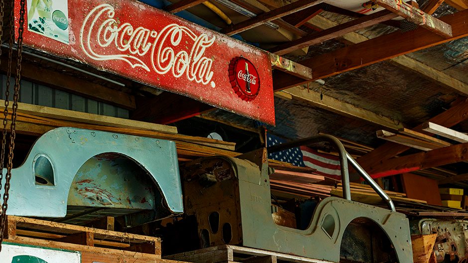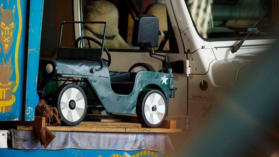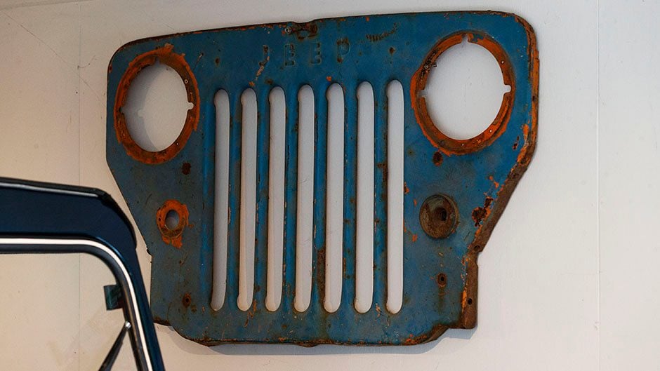 We delved inside to find a red CJ5 tucked away in the back. The CJ series was Willy’s ‘Civilian Jeep’, an evolution of the MB. The CJ5 was first introduced in 1955 when Willy’s had fallen under Kaiser Industries management. The CJ5 is recognisable for its rounded front fender guards and larger lights with the slats of that famous grille bunched more tightly together. The CJ5 had a few more concessions to civilian life, such as more form-fitting seats, backlit instruments and a larger windscreen to provide a semblance of extra protection from the elements. It still didn’t have any doors though.