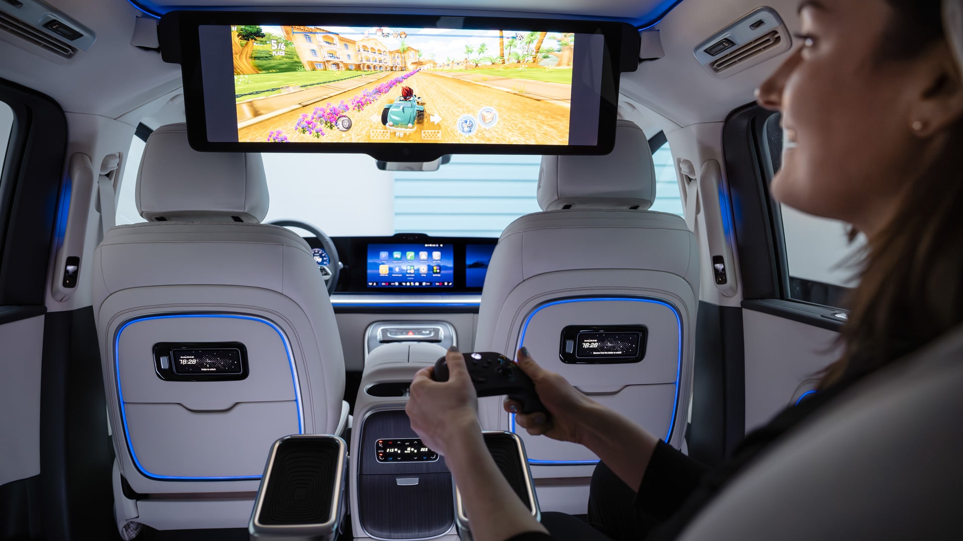 The 31-inch screen at the rear actually folds down from the roof, and can support up to 8K resolution. There’s also a 22-speaker Burmeister sound system to support it.
